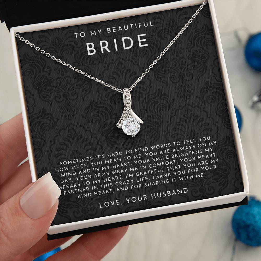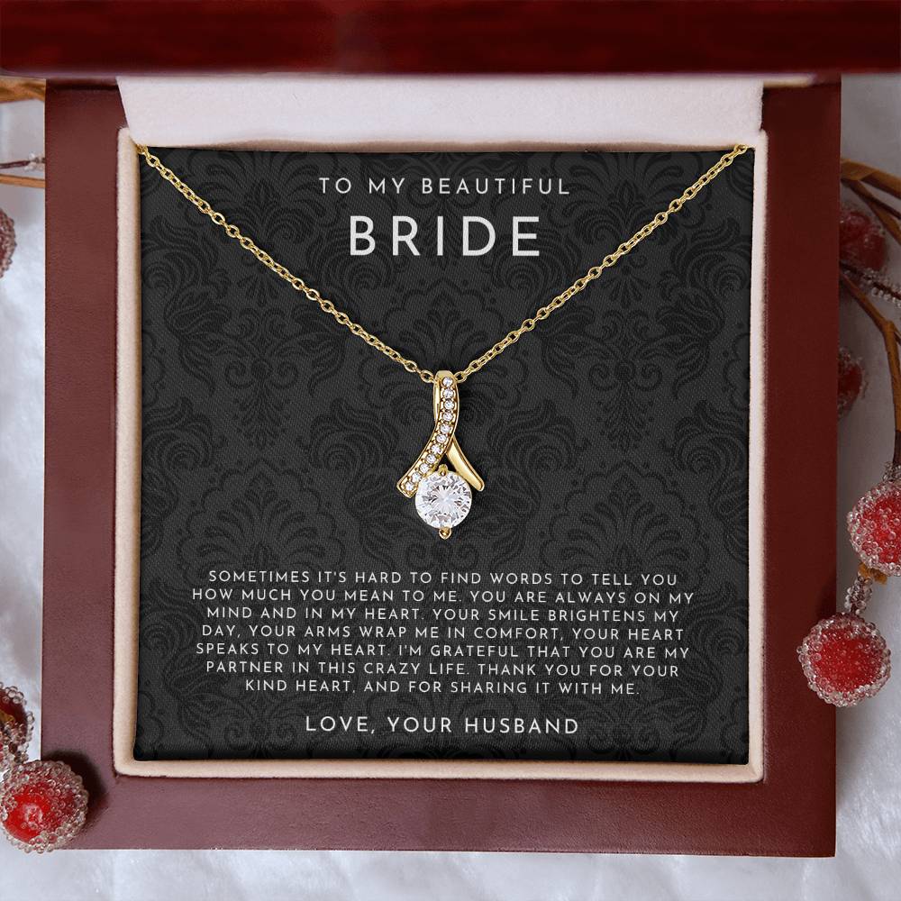 Give your beautiful Bride the gift that symbolizes your never-ending love. This Alluring Beauty necklace features a beautiful petite ribbon shaped pendant. It is the perfect and unique gift for that special someone this holiday season.